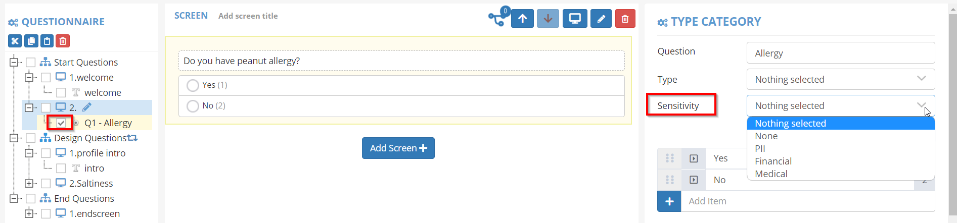 In EyeQuestion it is possible to flag questions as sensitive. There are three types of sensitivity: PII (Personal identifiable Information), Medical and Financial. The user can select the one that is applicable to that question. The main idea of all three sensitivities is the same, which is to scramble the sensitive data if someone doesn't have the right to view the results.